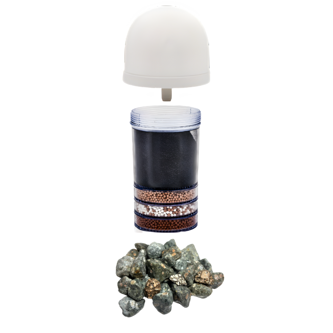 Mineralisatie: Mineralen cartridge ring met diverse mineralen, waaronder het bevorderlijke Germanium, absorbeert zware metalen, gifstoffen, geuren en onzuiverheden. De mineralen cartridge ring geeft continu meer dan 20 verschillende soorten mineralen vrij, ter bevordering van de gezondheid. (de ronde ring onder aan de foto)